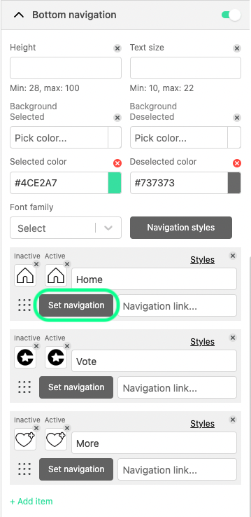 You can add navigation buttons by clicking on the green “+ Add item” on the bottom (Picture 2B). Add an icon for the menu item from your own images or Choicely’s library. Delete them from the “x” on the top right corner of each menu item (Picture 2D).